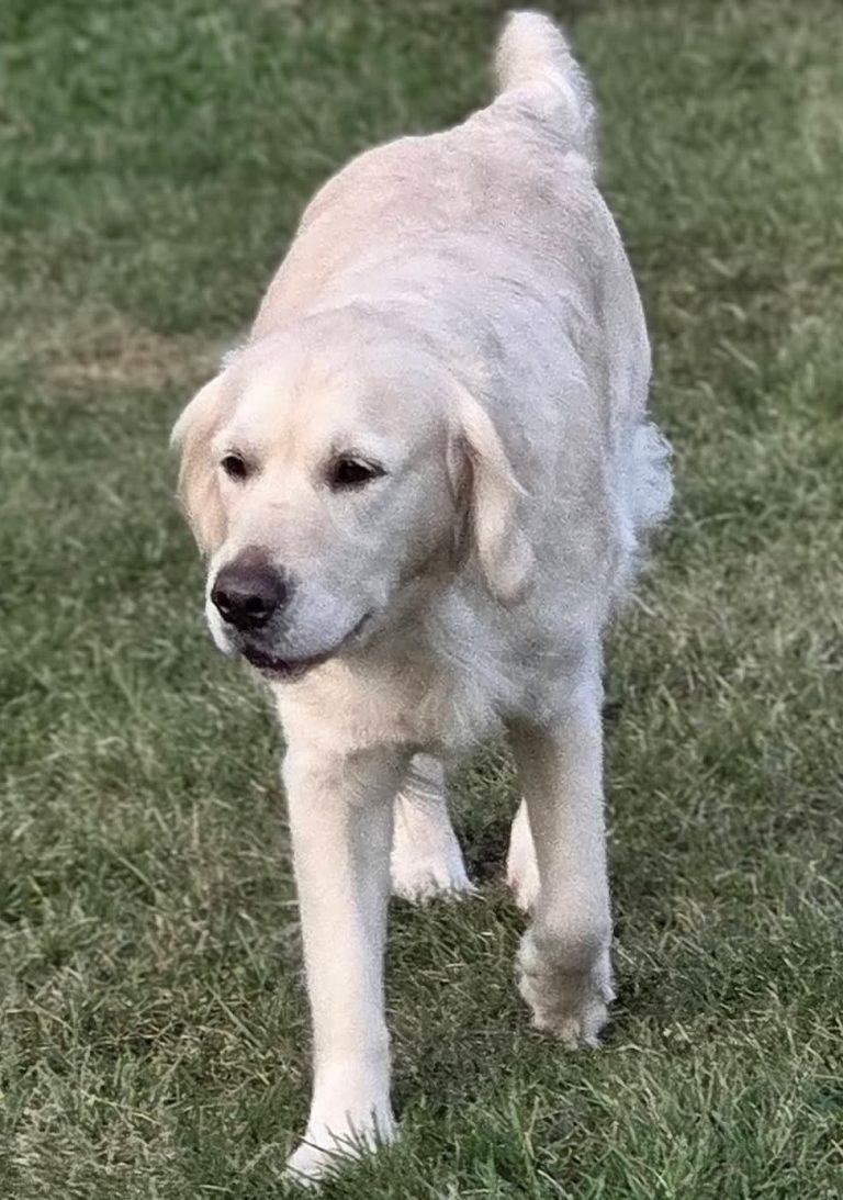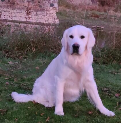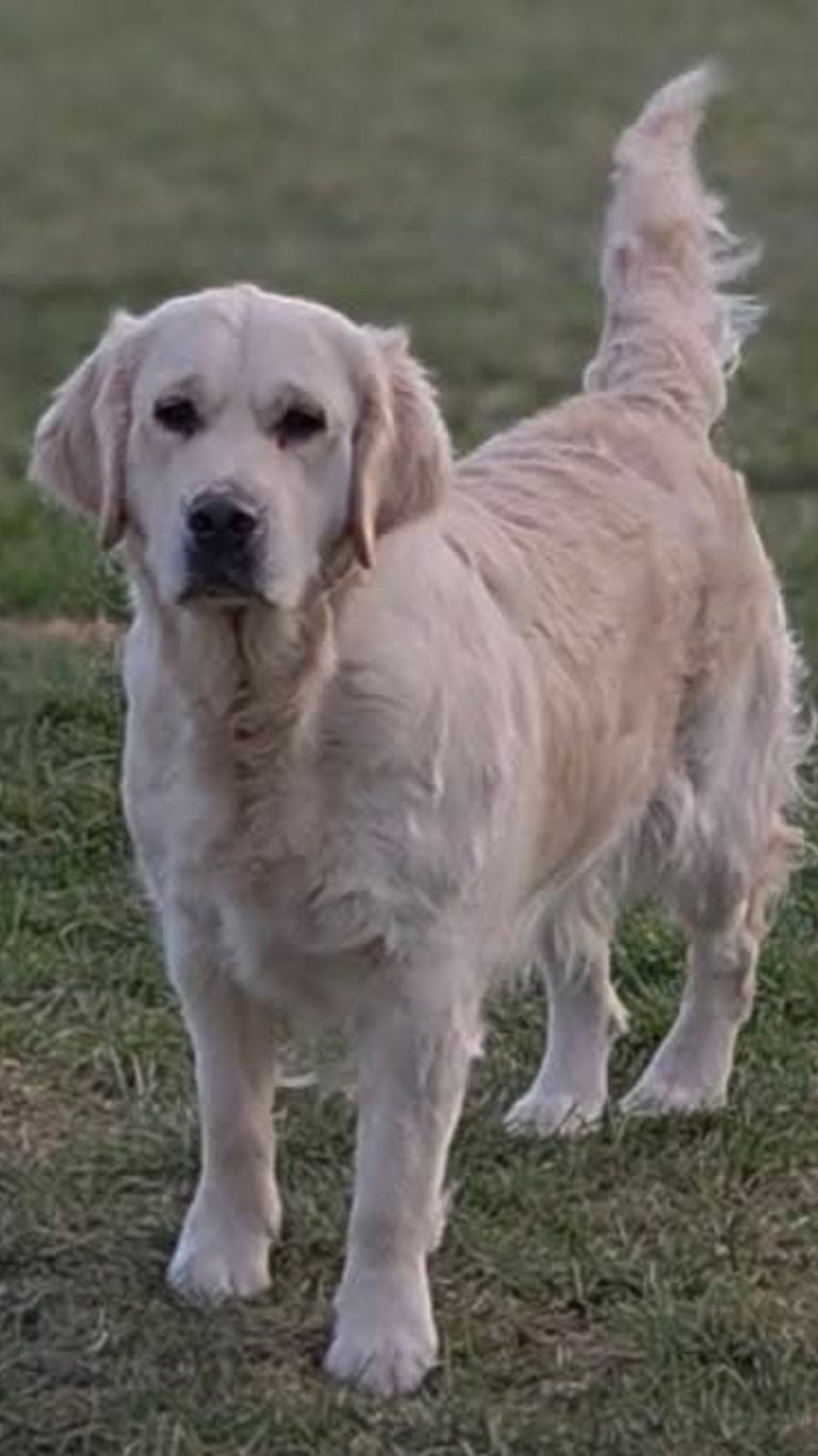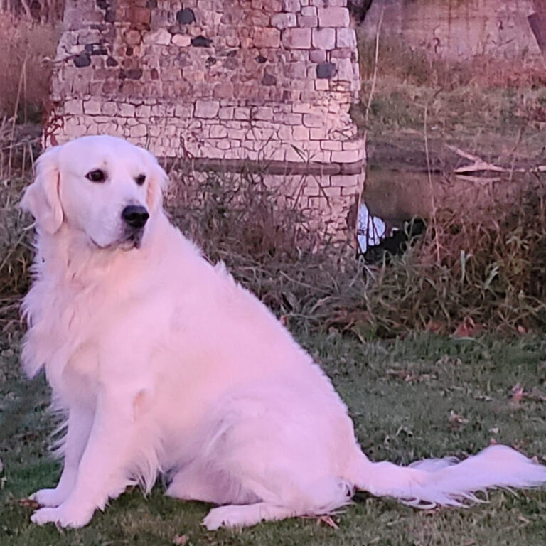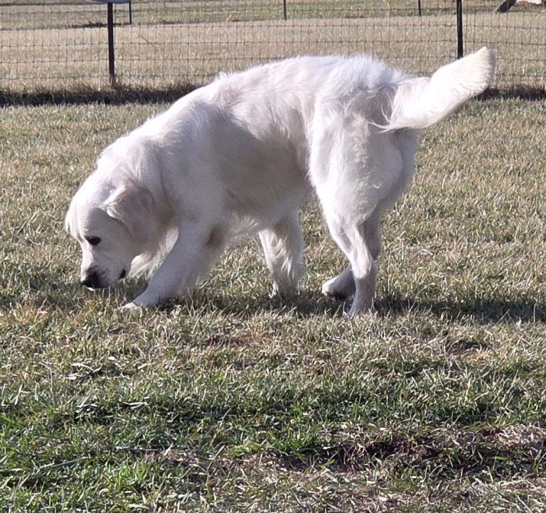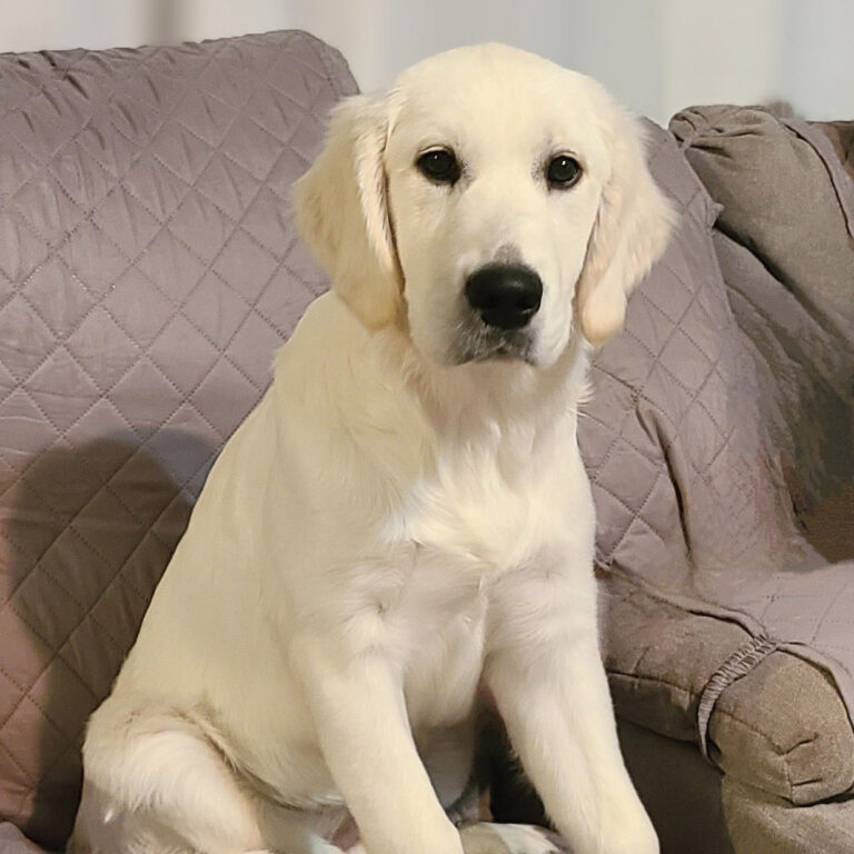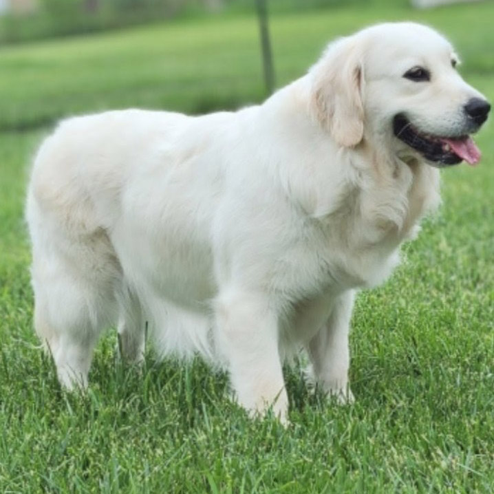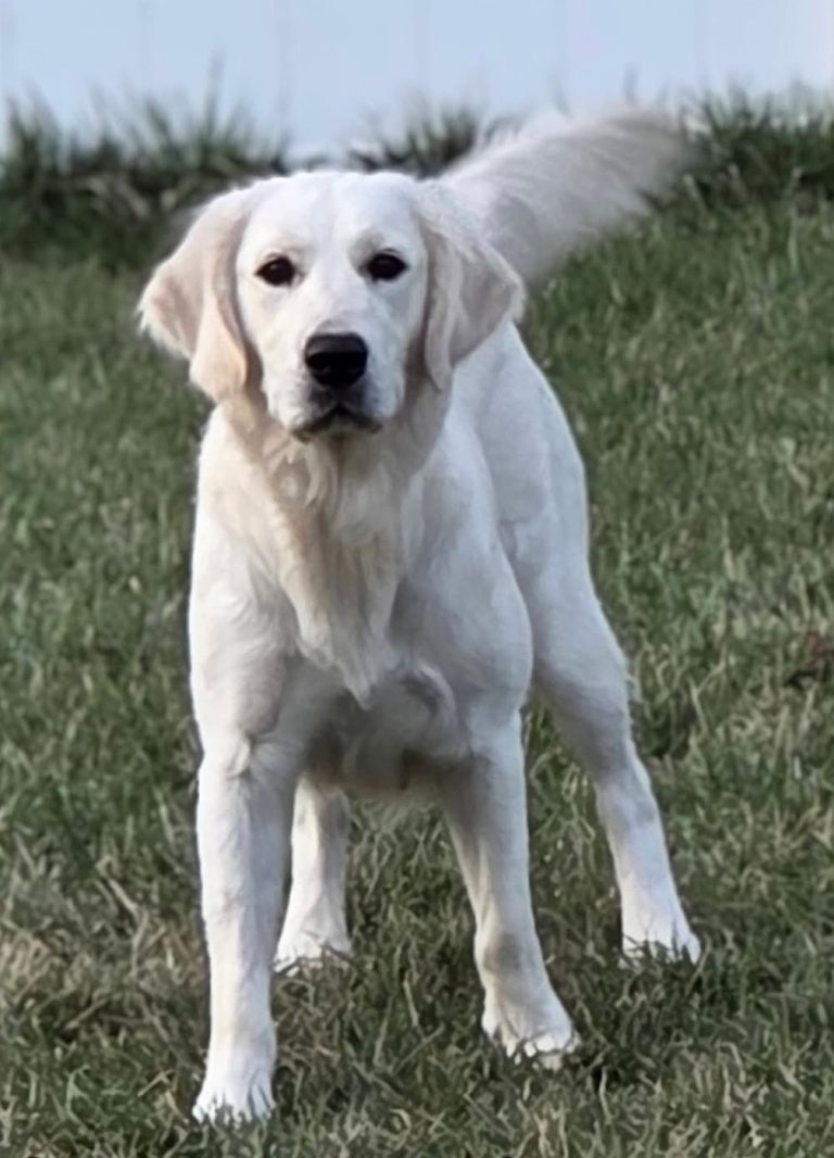 Jangle, known as Hzuston Bear Of Gold, is a prized Serbian addition to Elite White Goldens. Boasting over 15 generations of health tested champion lineage. He is admired for his intelligence, charm, and top-notch health. Jangle is a solid 77#s, has a blocky head with a white stocky body. His coat is wavey and soft and glistens in the sun. He is very smart and a caregiver to his humans. Meaning he waits to see what you want from him next. He is a shadow to his humans as well as a lap dog. Jangle is a proven stud. He does natural and with collecting semen.