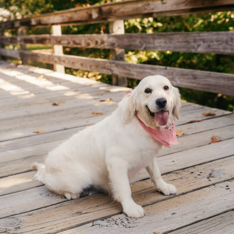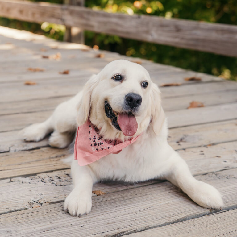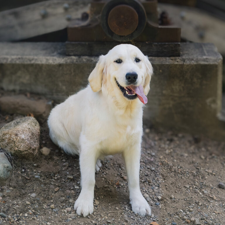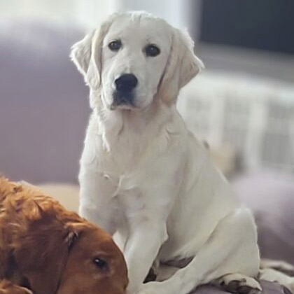 Emmy Lou is a stunning Golden Retriever! She is from Serbian lineage that can be easily traced through her parents Breeze and Jangle. Emmy is a stocky little lady weighing 61#s. Her coat is thick, white and wavey. She is very intelligent and affectionate. Her days consist of walks, training and playtime with the rest of the pack. Emmy has earned her Canine Good Citizenship Certification.